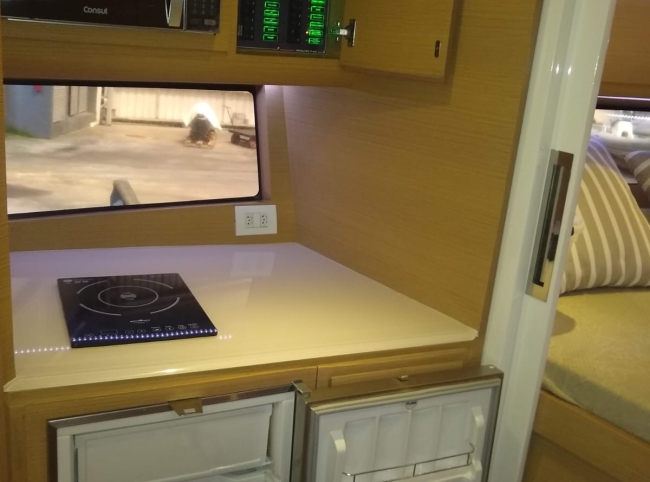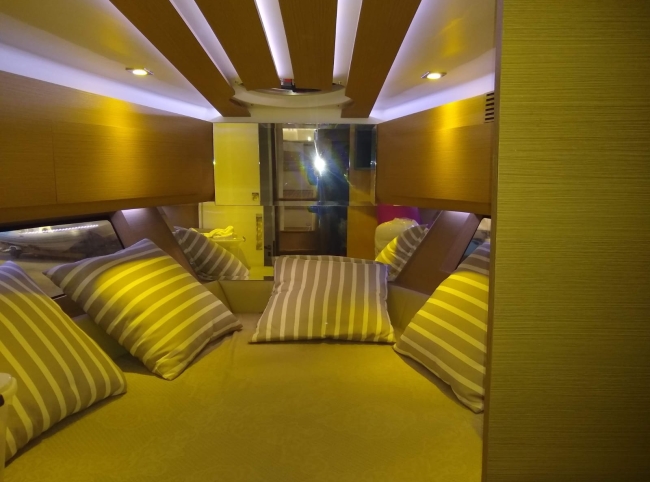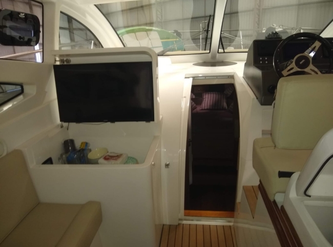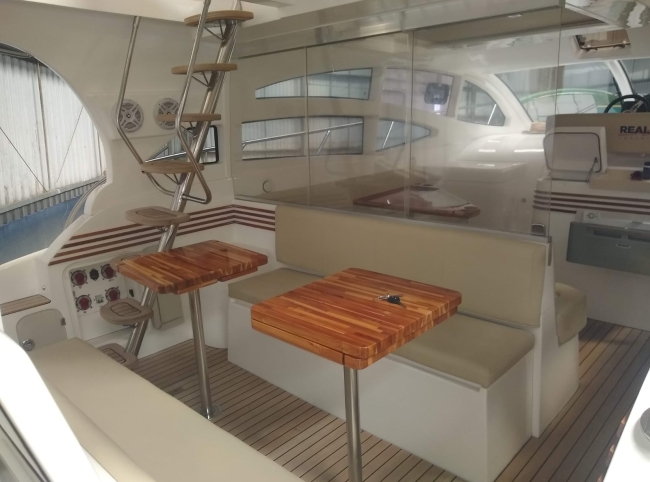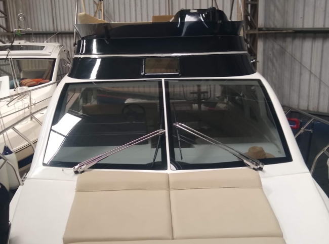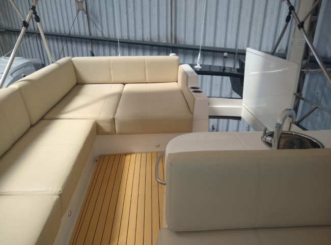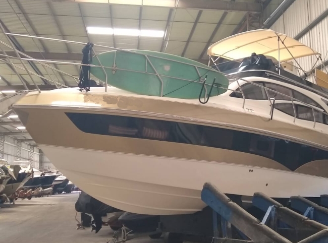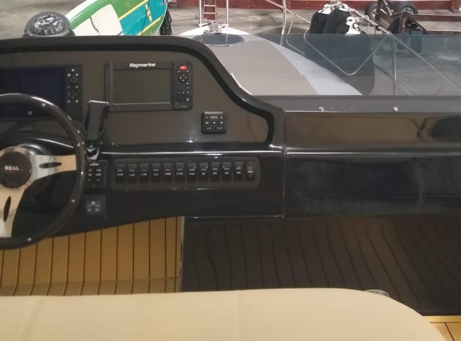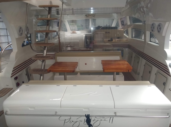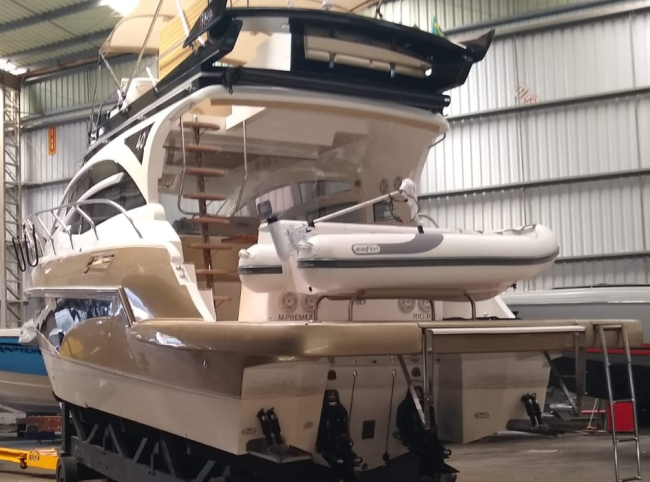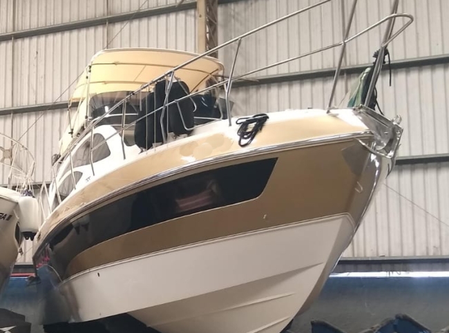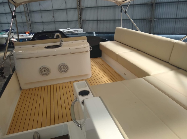 - Acessórios: Guincho elétrico Vaso elétrico Player Bluetooth Hertz Alto falantes Hertz Amplificadores 2 Subwoofer Hertz 2 Vessel View 7” substituindo os relógios Flap 2 estações 2 Rádios VHF Gerador Kohler 9KVA (30 H) 2 Ar condicionados Carregador Tomada de Cais TV 32” no Cockpit TV 24” no Camarote de proa Antena de TV Micro-ondas Frigobar Fogão de Indução 1 boca Boiler elétrico Churrasqueira carvão Teka Cockpit Teka plataforma de popa Salvatagem Incompleta Fechamento de cockpit manual Frigobar de gaveta no cockpit Piso EVA no FLY Luz de Top Strobo Luz Subaquática Geleira extra no móvel gourmet Carreta com Pneus maciços Lona de cobertura Deck Beach